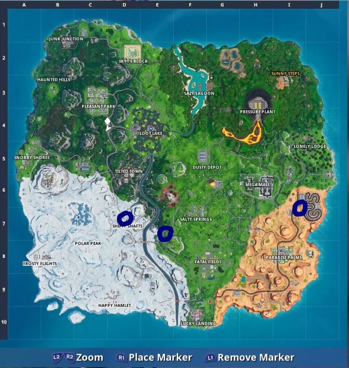Lite resa till de nästa två, men gå förbi Saltfjädrar Och du hittar en annan skylt till sydväst av det – det är i sektorn E7 Om du kämpar. Slutligen, för att avrunda denna lista över alla graffiti-täckta skyltar i Fortnite, gör den korta vandringen till Skiftande axlar, .