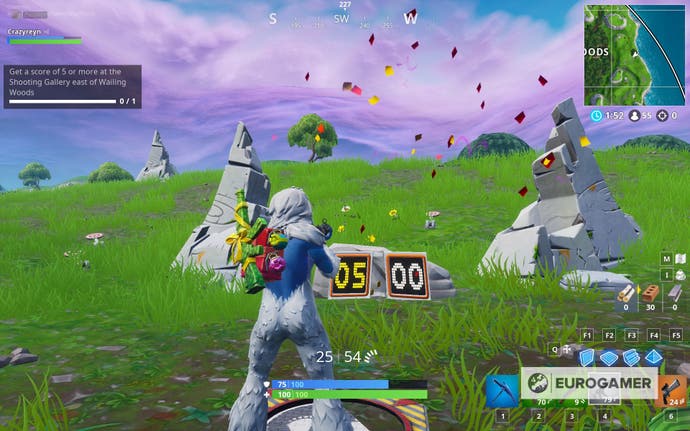 Vecka 10 startade torsdag morgon, och annat än en lat omväxlad utmaning om att besöka expeditionsutposter, den enda andra som kräver vägledning är en trestegsutmaning som börjar med ”Få en poäng på 5 eller mer på skjutgalleriet öster om Wailing Woods.”Varje skjutgalleri bör se ut och känna sig bekant för spelare. De använder samma pop-up Red Bullseye-mål som vi alla har sett tidigare.