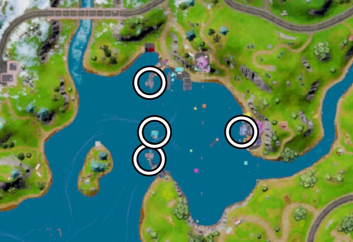 Vid den här tiden, Fortnite grupperade alla dykbrädor du måste hoppa tillsammans i Byte sjön. Det finns fyra av dem här.