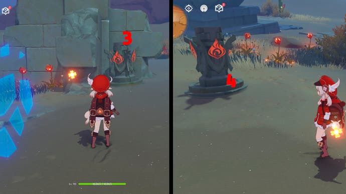 Nyckeln till att lösa detta pussel är antalet flammande blomsterstamen bredvid varje pyromonument. Den första totemen är inte omgiven av några röda blommor, vilket innebär att sista totem att aktivera bör ha Fyra blommor endast.