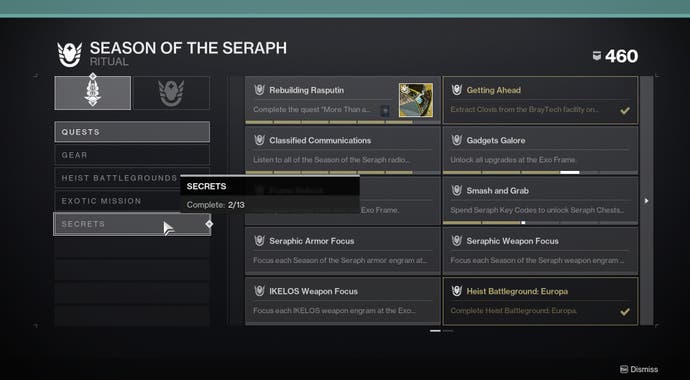 Det finns dock ett antal triumfer som kan hjälpa dig att se hur du mår. Öppna din meny, navigera till triumfsida, och välj Säsong av Seraph. Härifrån väljer du Hemlighet kategori och lägg din ikon över Förstörelse av drönare triumfer för att se framsteg.